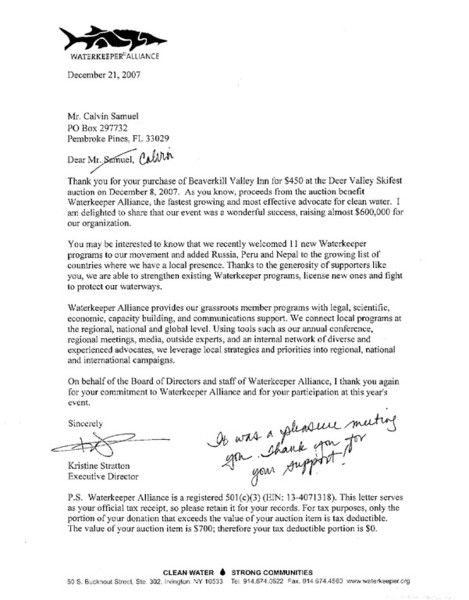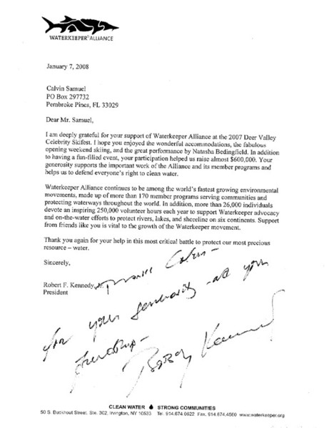 The Alfred Family Foundation, Director Calvin M. Samuel has attended several Waterkeeper Alliance benefit events such as the Deer Valley Celebrity Ski Fest held annually in Park City, Utah. The Alfred Family foundation vows continual support of Waterkeeper Alliance and to further a long term relationship with Waterkeeper Alliance in years to come.